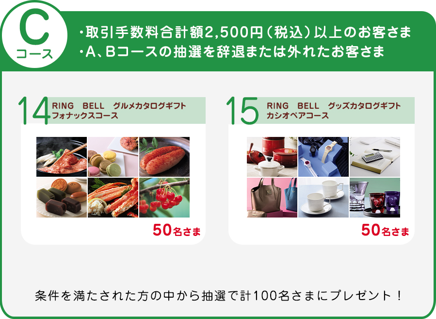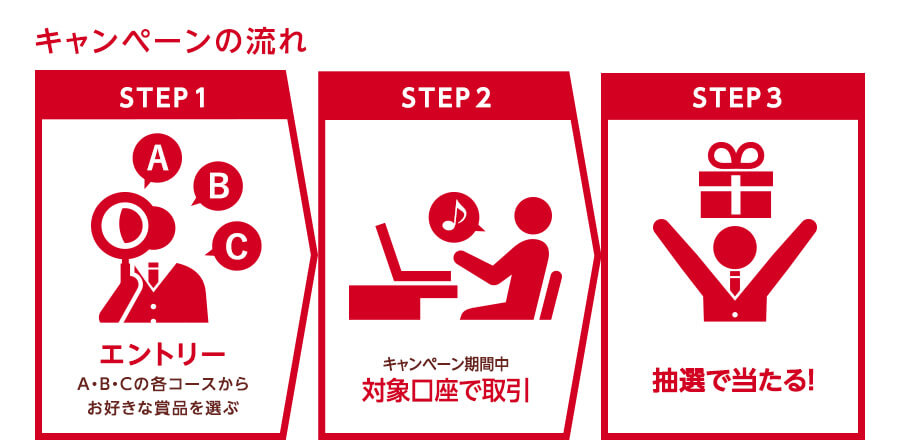 取引手数料2,500円以上のお客さまの中から抽選で100名さま(各賞品50名さま)にプレゼントいたします。また、A、Bコースの抽選を辞退もしくは外れた方も抽選の対象となります。