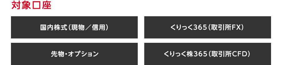 上記対象口座における期間中の取引手数料合計額がキャンペーン対象となります。なお、くりっく365につきましてはこちらをご覧ください。