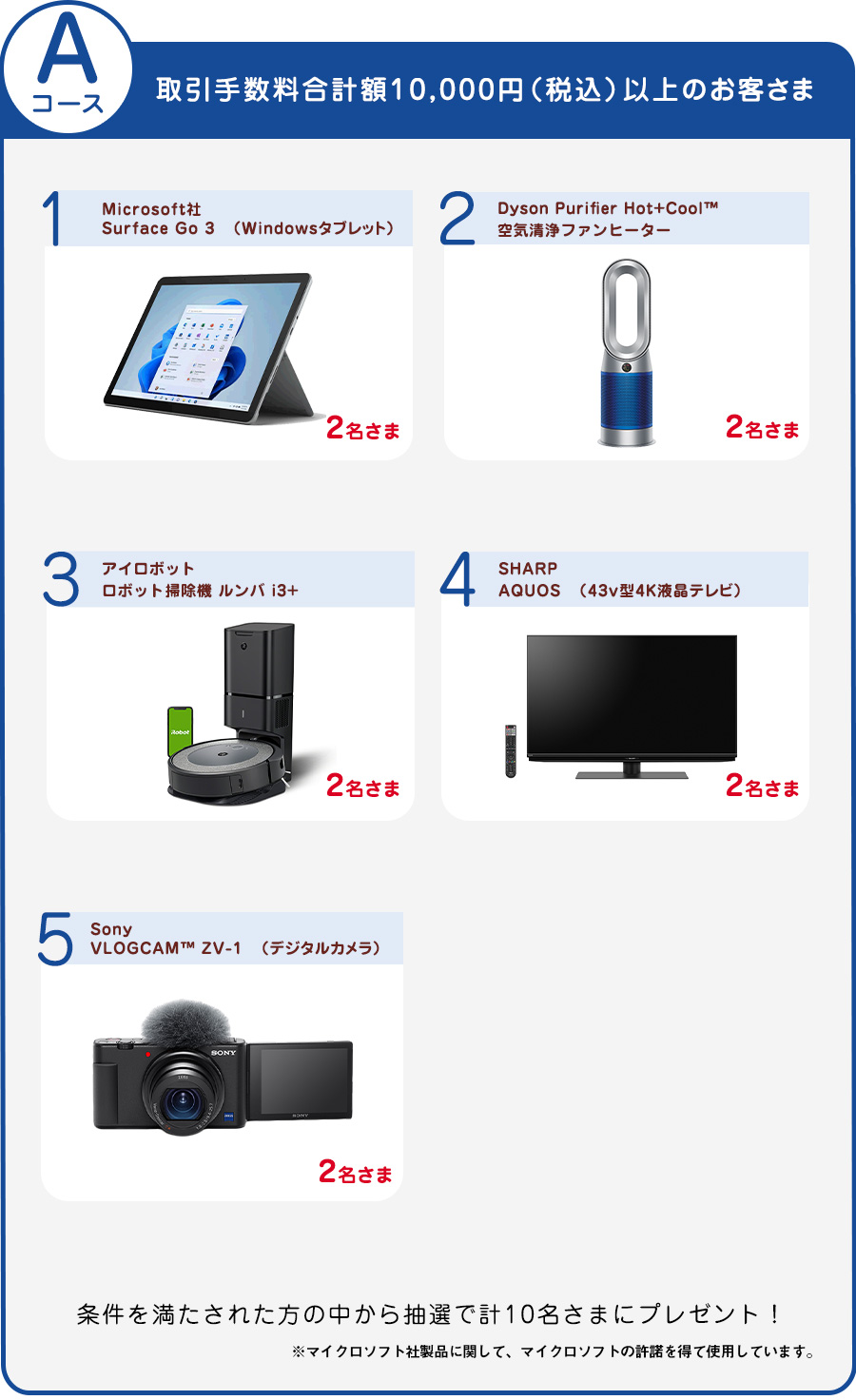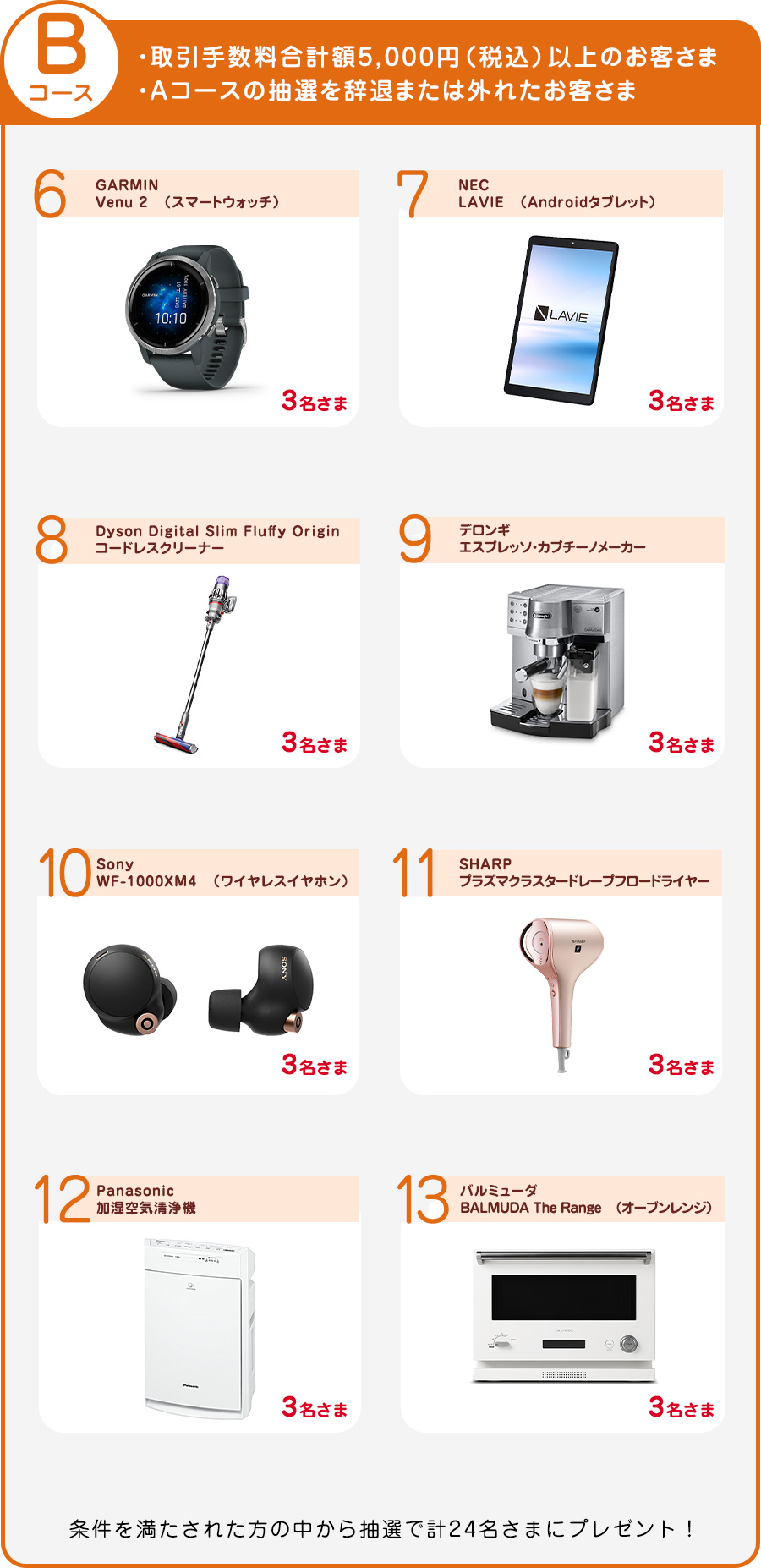 取引手数料5,000円以上のお客さまの中から抽選で24名さま(各賞品3名さま)にプレゼントいたします。また、Aコースの抽選を辞退もしくは外れた方も抽選の対象となります。