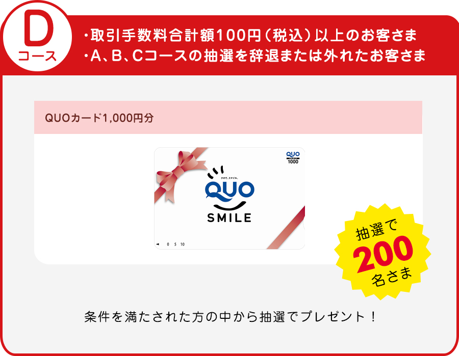 取引手数料100円以上のお客さまの中から抽選で200名さまにプレゼントいたします。また、A、B、Cコースの抽選を辞退もしくは外れた方も抽選の対象となります。