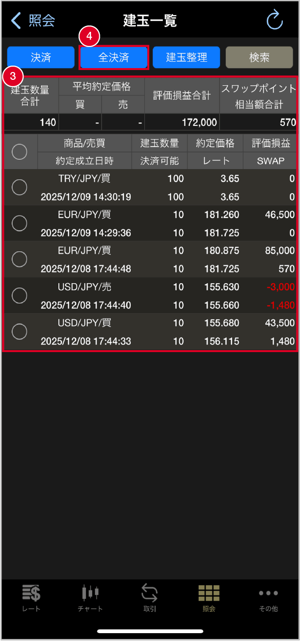 ※取引時間外の商品についての建玉を保有している場合は、全決済注文は発注できません。