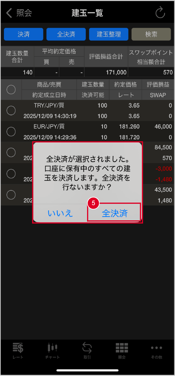※建玉を選択した場合や商品、売買、決済注文状況で絞り込まれた建玉ではなく、口座に保有中の全ての建玉が決済されます。