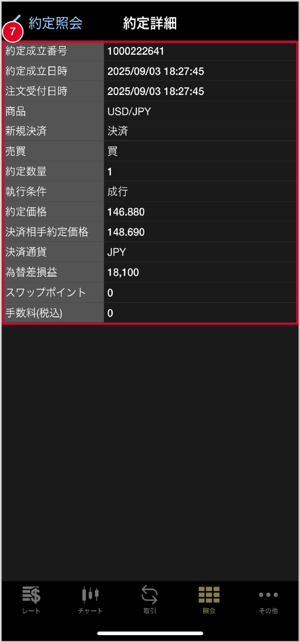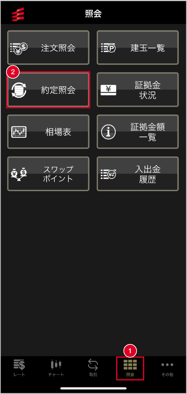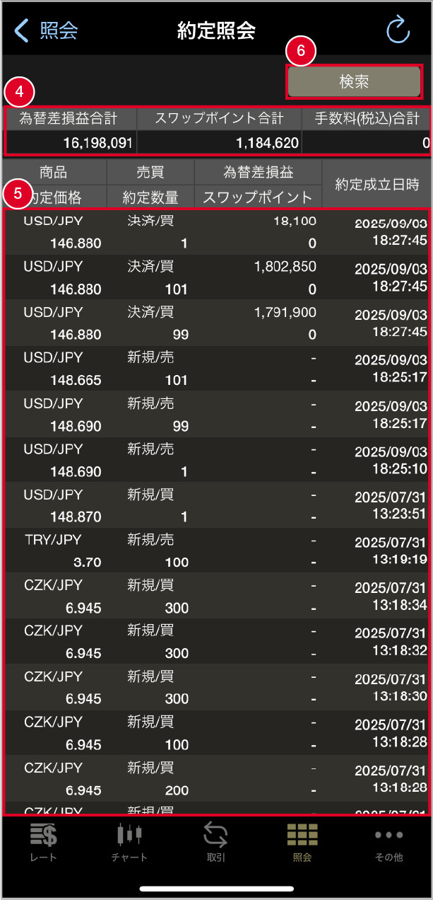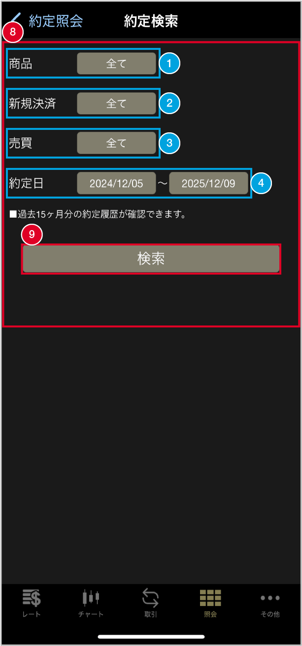 約定状況を確認できます。検索機能を使うことで、商品別・約定日別に表示することができます。
