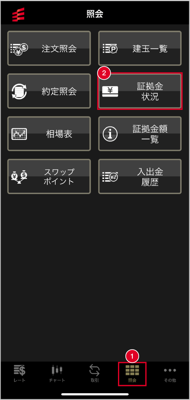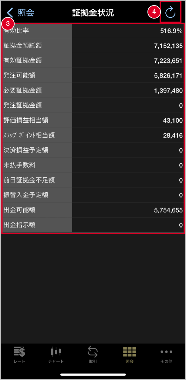 現在の証拠金状況を確認できます。有効比率、証拠金預託額、有効証拠金額、出金可能額などが表示されます。