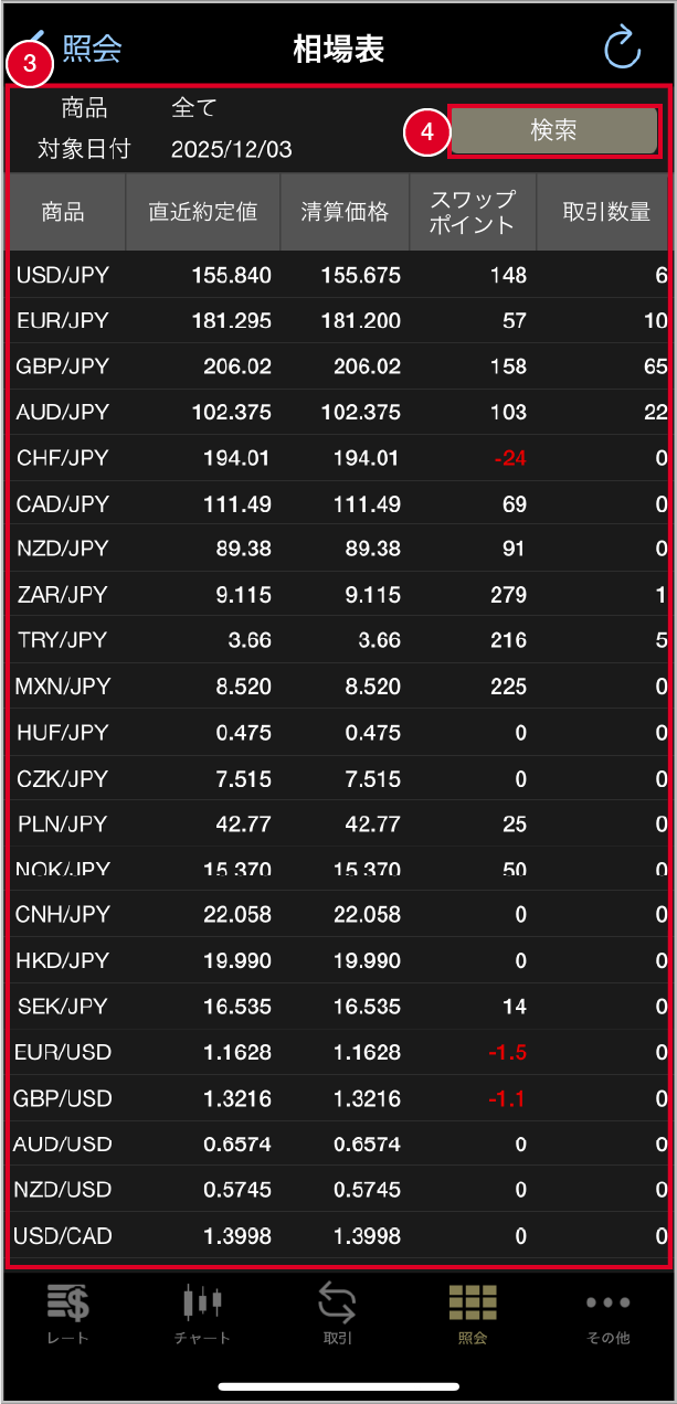 直近約定値、スワップポイント、取引数量、清算価格などが確認できます。検索機能で対象日付を指定して表示できます。