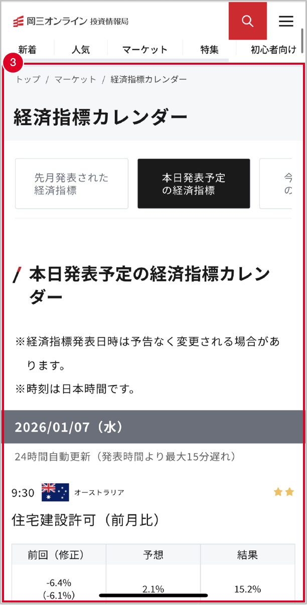 経済指標カレンダーを閲覧できます。各国の経済指標の重要度や予想値、結果などが確認できます。