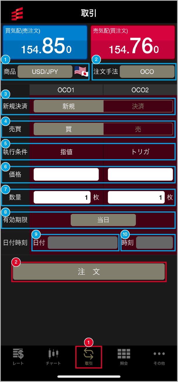 価格:OCO1は指値価格、OCO2はトリガが発動する価格を入力します。