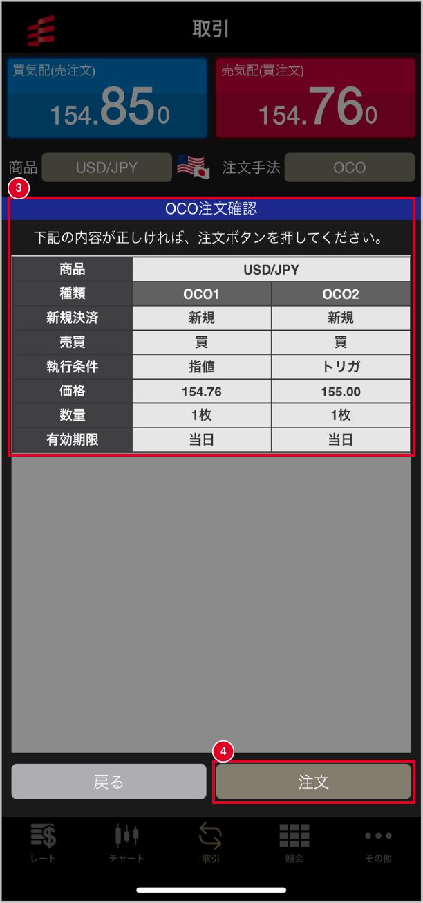 OCO注文確認画面が表示されます。