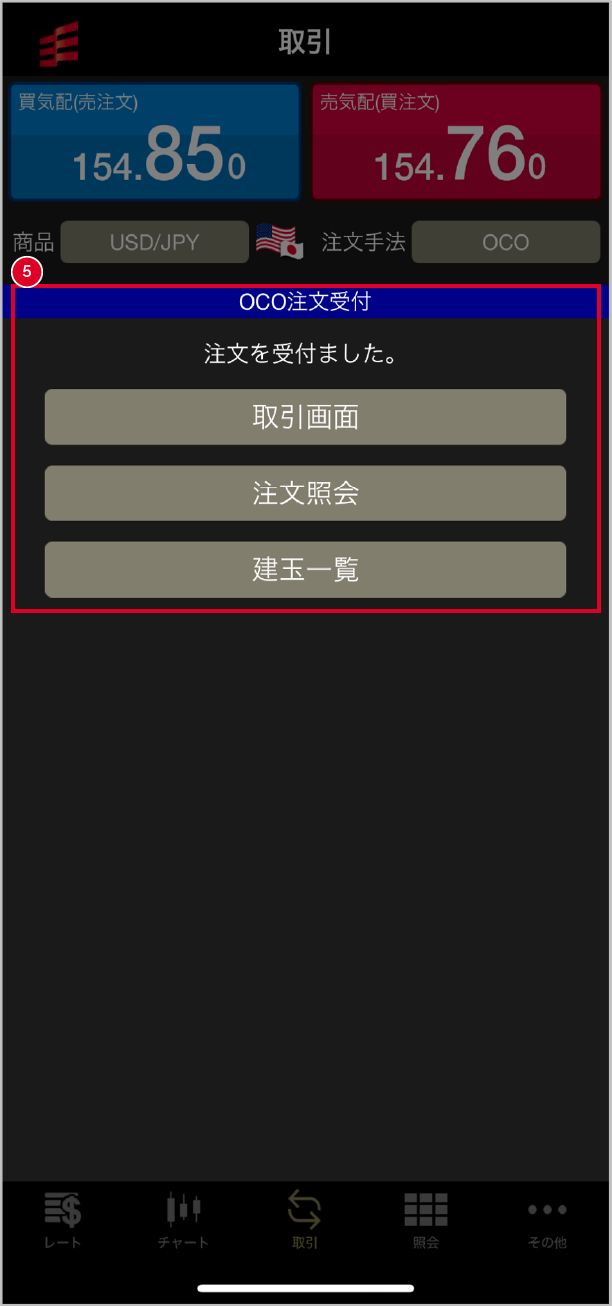 注文を受付ました。【取引画面】【注文照会】【建玉一覧】へ遷移することができます。