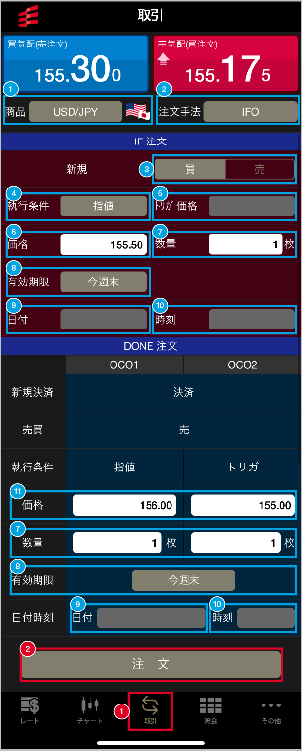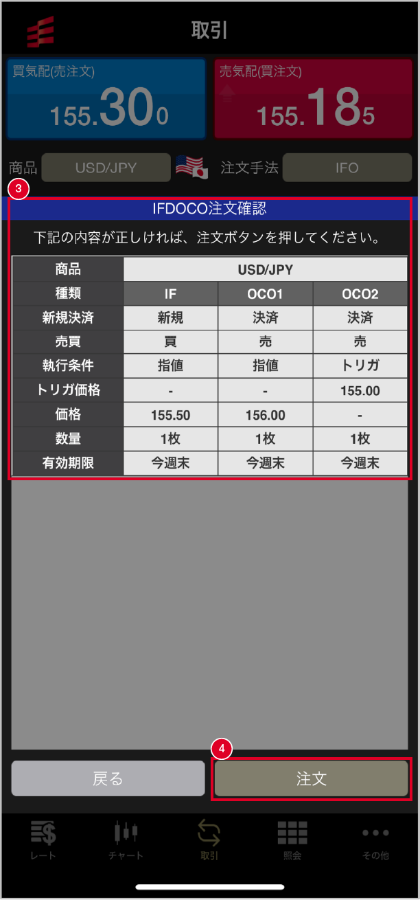 売買:If注文を買注文にするか売注文にするか選択します。Done注文は自動的に反対売買となります。