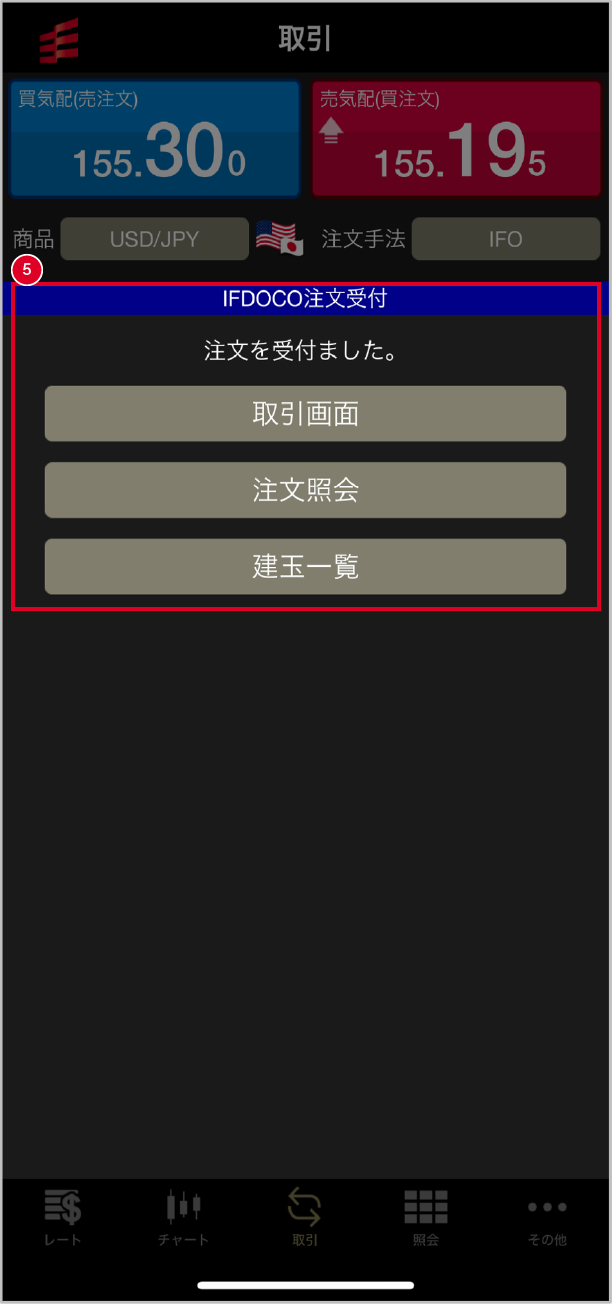 注文を受付ました。【取引画面】【注文照会】【建玉一覧】へ遷移することができます。