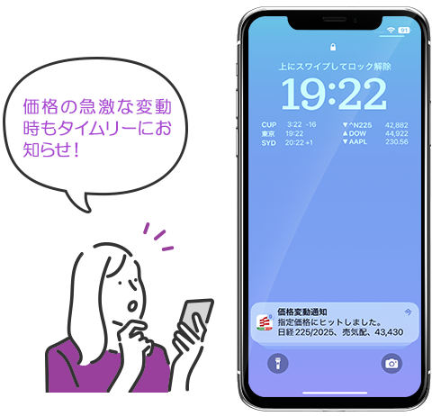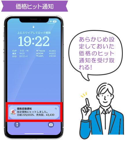 「価格ヒット通知」、「価格急変通知」を受信することができます。価格ヒット通知は、あらかじめ設定しておいた価格に到達したタイミングで通知され、価格急変通知は急騰、急落した場合に通知されます。