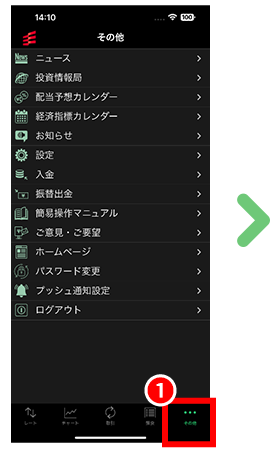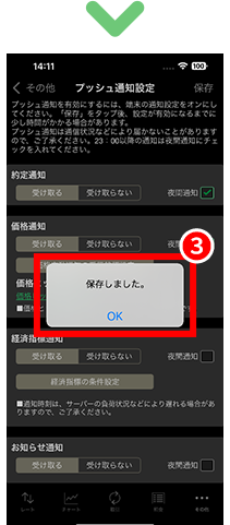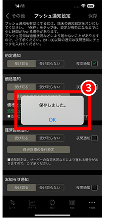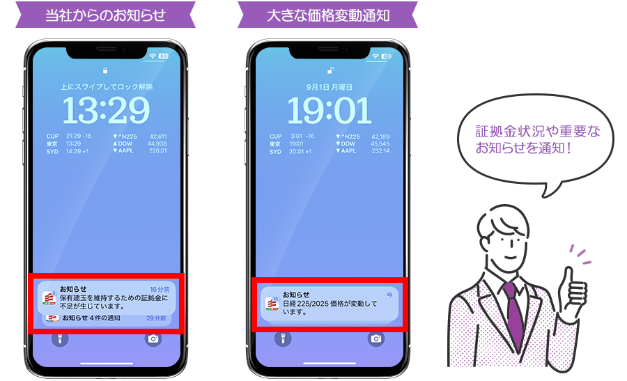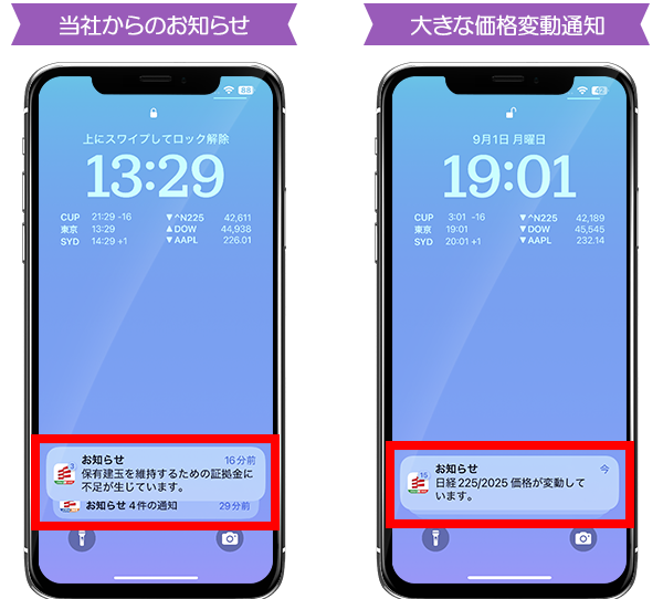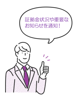 「当社からのお知らせ」、「大きな価格変動通知」、「追証通知」、「ロスカット通知」を受信することができます。