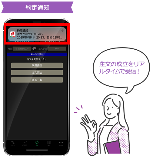 相場急変時や注文約定時、経済指標発表の直前通知など、取引に関する情報をリアルタイムにスマートフォンへお知らせします。