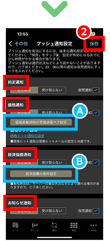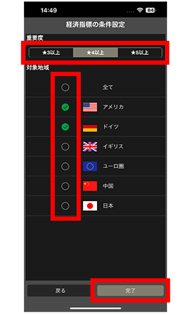 「経済指標通知」は指標発表の直前に受信することができます。重要度や地域ごとに、通知される経済指標を設定できます。