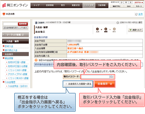 確認画面が表示されます。入力した内容をご確認ください。内容にお間違えがなければ取引パスワードを入力し、「出金指示」ボタンをクリックします。修正を行う場合は「出金指示入力画面へ戻る」ボタンをクリックしてください。