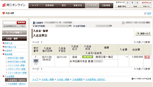 出金指示の内容は【入出金・振替】-【入出金・振替】-【入出金照会(当日分)】でご確認いただけます。