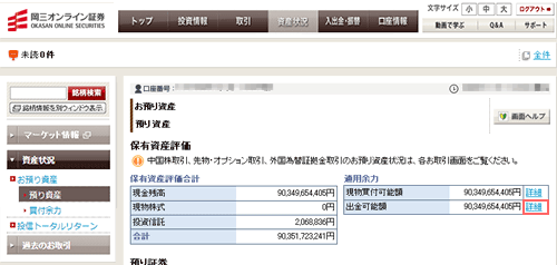 証券総合取引口座ログイン後の【資産状況】-【資産状況】-【預り資産】画面からご確認いただけます。「出金可能額」の「詳細」リンクをクリックしてください。