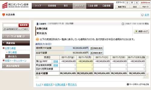 【資産状況】-【資産状況】-【買付余力】画面の出金可能額の「詳細」が表示された状態が表示されます。